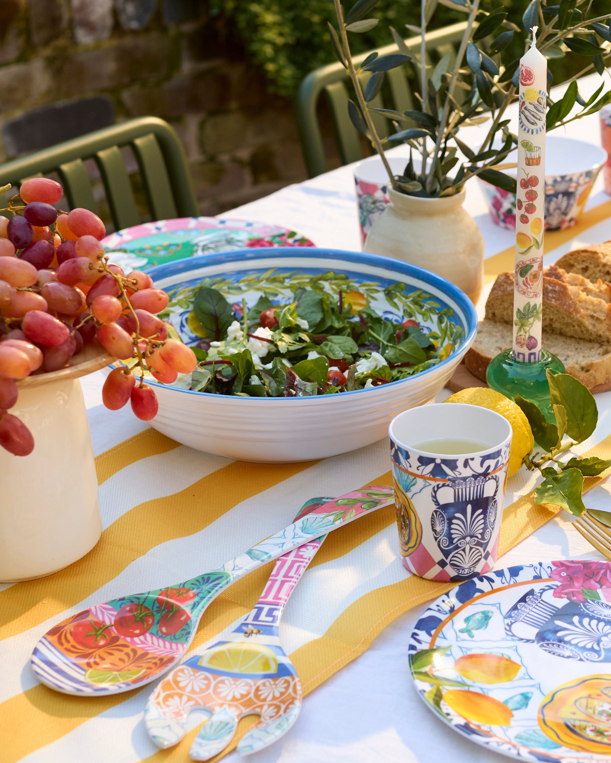 Crafted from durable melamine, this large salad bowl brings the vibrant flavours of the Mediterranean to your table with captivating illustrations. Featuring iconic greek patterns and mosaics will illustrated lemons, and Mediterranean motifs. Elevate your salads and add a touch of Mediterranean flair to your meals with La La Land's Mediterranean Summer Salad Bowl, perfect for using at home or taking out for picnics.